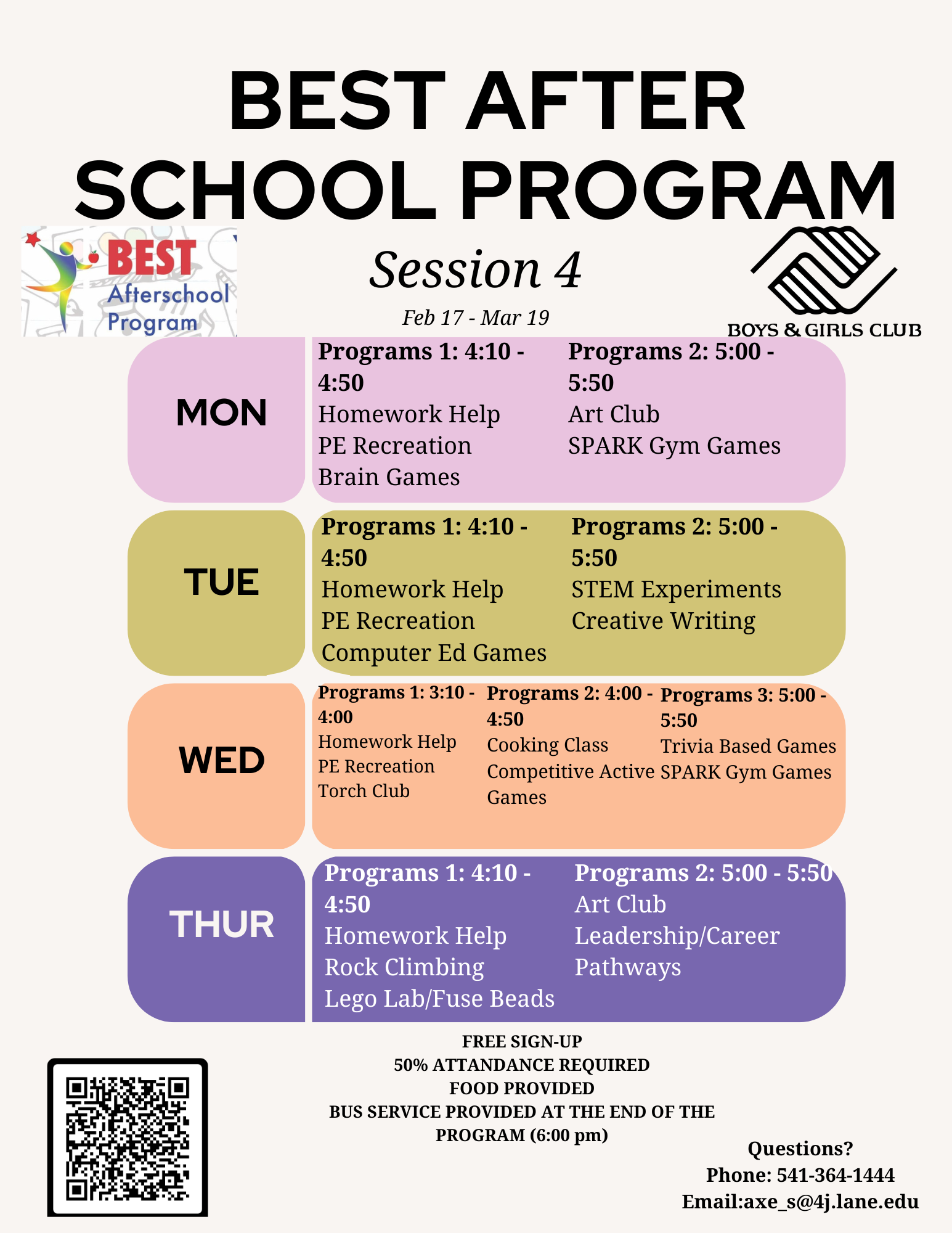 Want a ride home after track and field? Join the BEST after-school program! Enrollment is free, and we will provide snacks to students before track and a ride home at 6:00 pm after the program. If you have any questions, you can call or text 541-364-1444 or Email axe_s@4j.lane.edu.